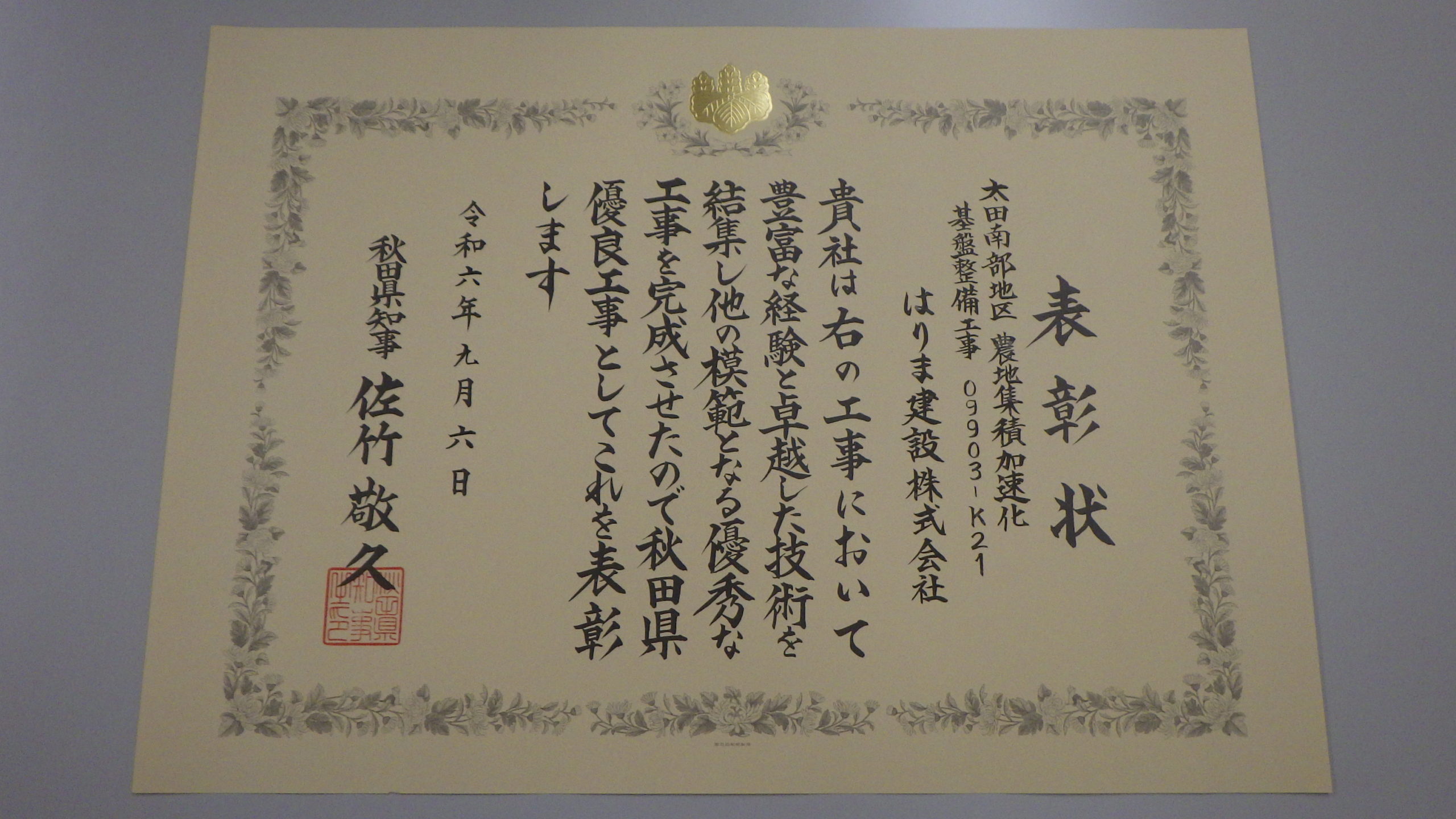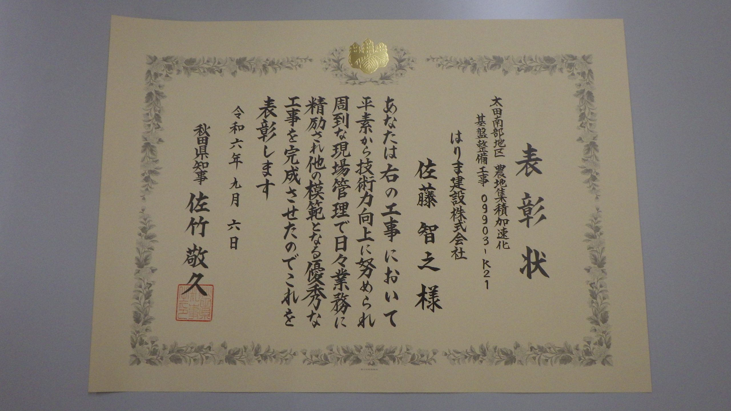 第45回秋田県優良工事表彰に当たり、令和5年度に施工しました「太田南部地区 農地集積加速化基盤整備工事09903-K21」が秋田県優良工事表彰を受賞しました。