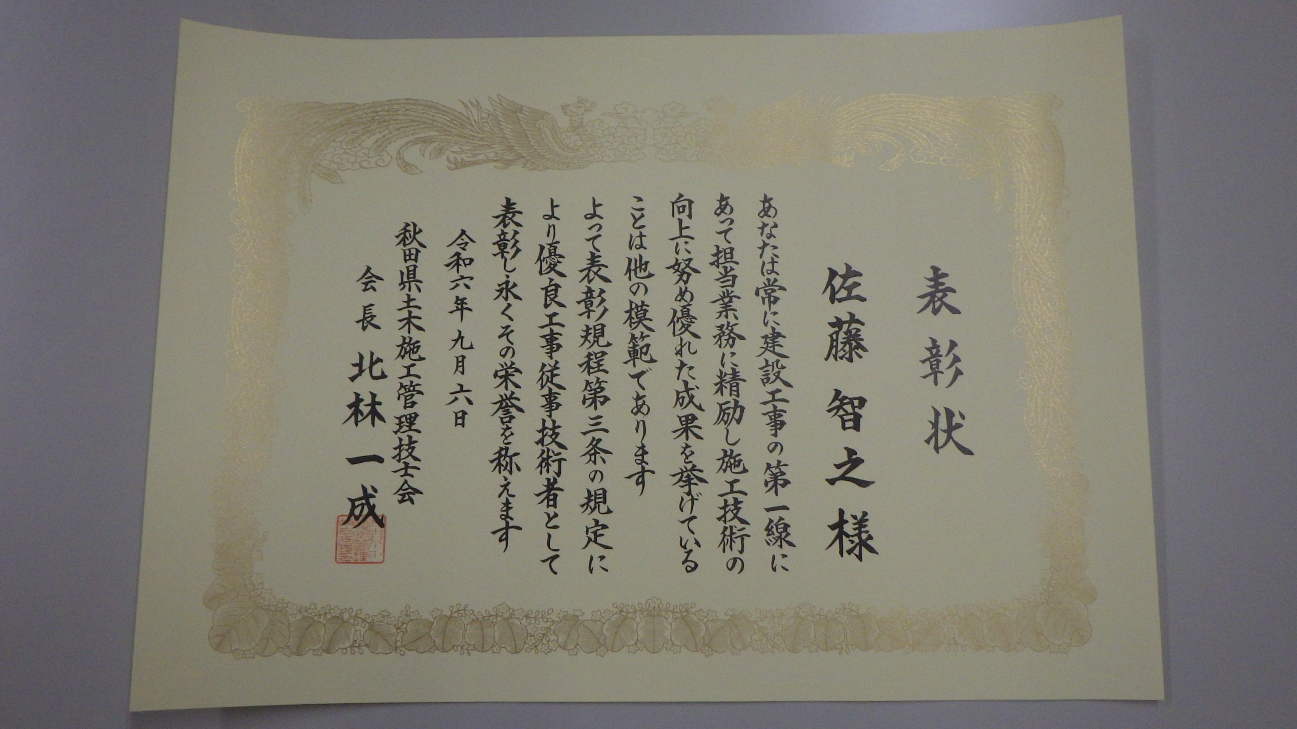 また、秋田県土木施工管理技士会表彰に当たり、監理技術者 佐藤智之 主任が優良工事従事技術者として表彰されました。