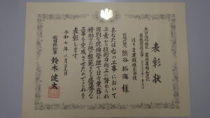 また、秋田県土木施工管理技士会表彰に当たり、現場代理人 熊谷拓海 主任が優良工事従事技術者として表彰されました。