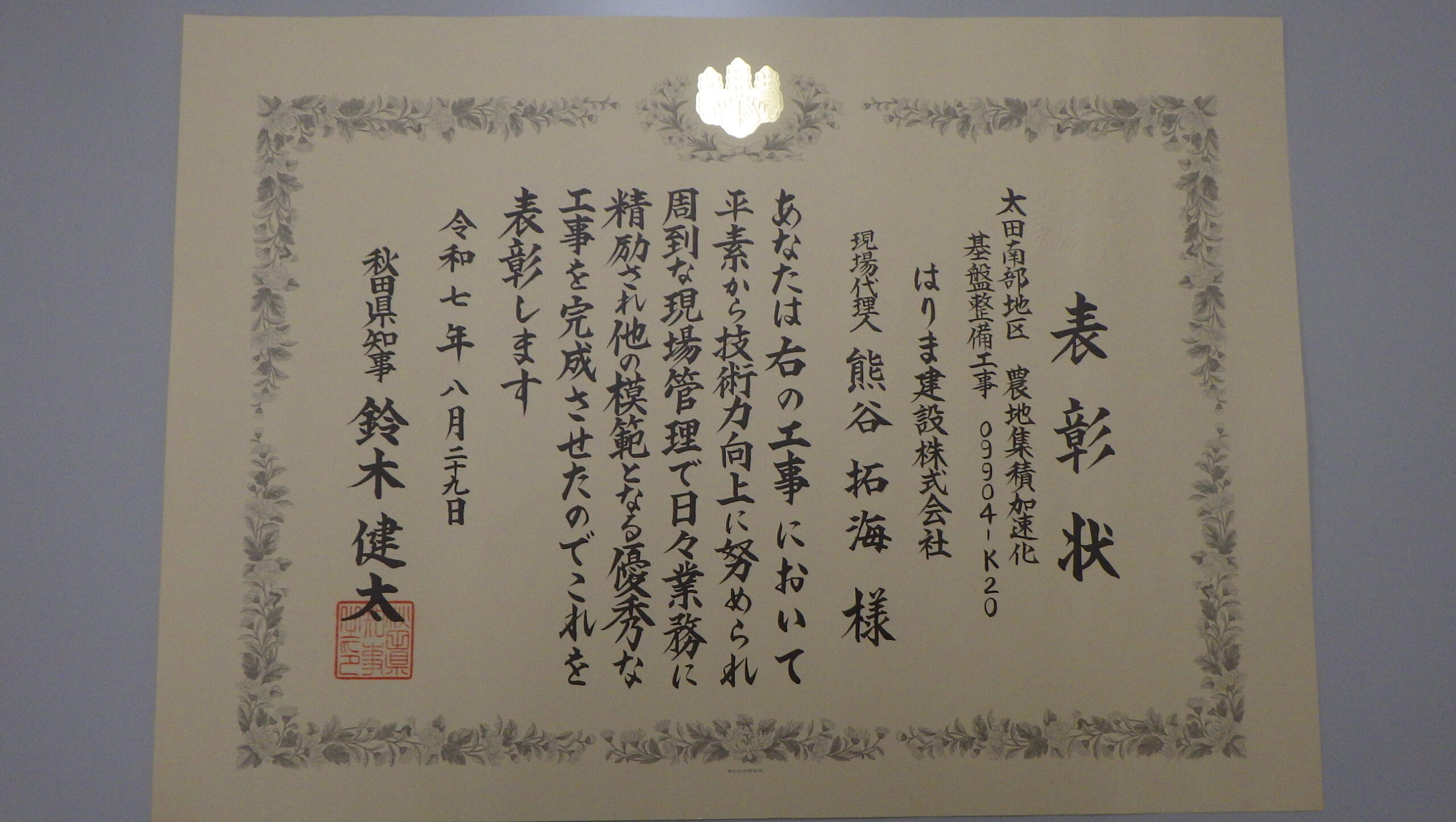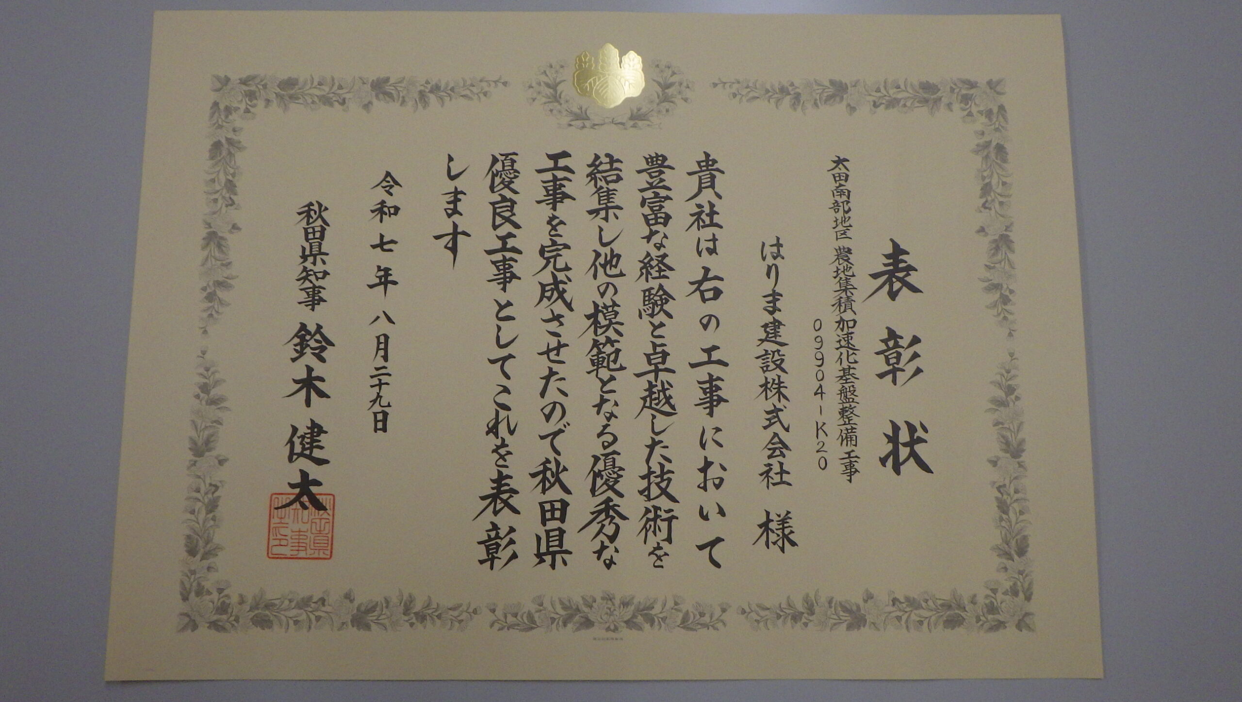 第46回秋田県優良工事表彰に当たり、令和6年度に施工しました「太田南部地区 農地集積加速化基盤整備工事 09904-K20」が秋田県優良工事表彰を受賞しました。