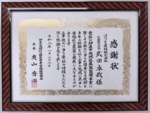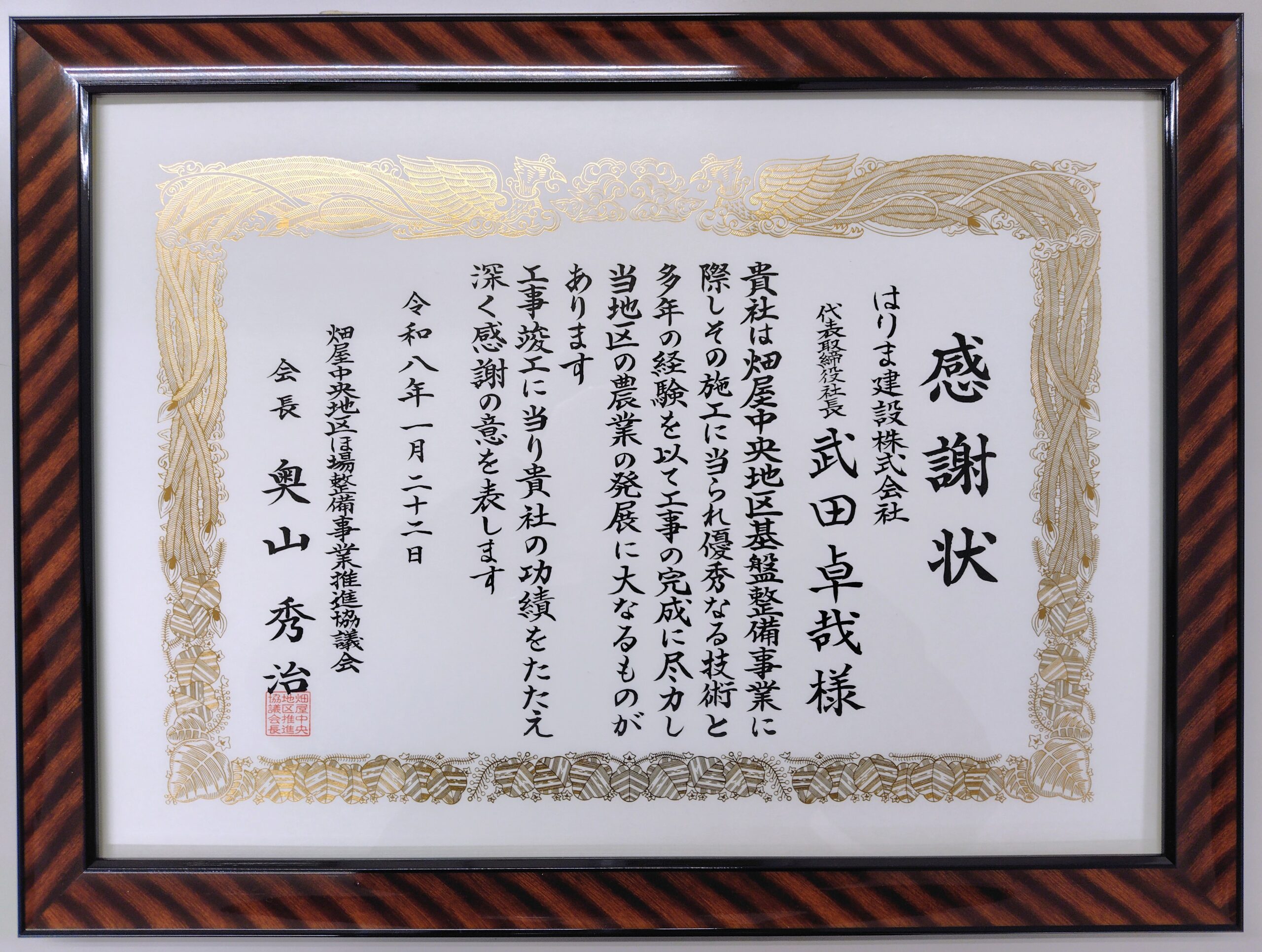 1月22日に、畑屋中央地区基盤整備事業に係る竣工神事並びに記念式典と祝賀会が開催され、当社が関係施工業者18社を代表して、感謝状が授与されました。 今回の感謝状は、過去から継続して当該地区の工事に携わり、誠実に実績を積み重ねてきたことが評価されたものです。 当社にとって大変名誉なことであります。 本事業にご尽力いただいた関係者の皆様に深く敬意を表しますとともに、基盤整備を契機として、農地集積が加速し、農業がより一層力強く発展されますことを心より祈念いたします。