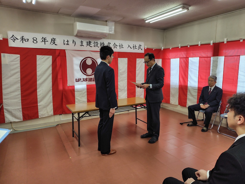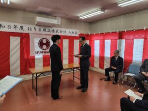 式では社長より辞令が交付され、新入社員代表による力強い誓いの言葉と、それぞれの自己紹介が行われました。新たな一歩を踏み出した2名を、役職員一同、大きな期待とともに心から歓迎しております。